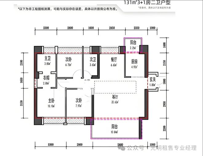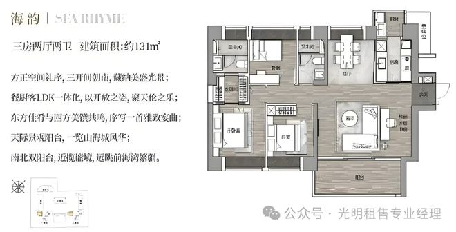 131㎡三房两卫,南北头通户型,客厅开间5.8米,带一个大阳台,主卧南北通透。