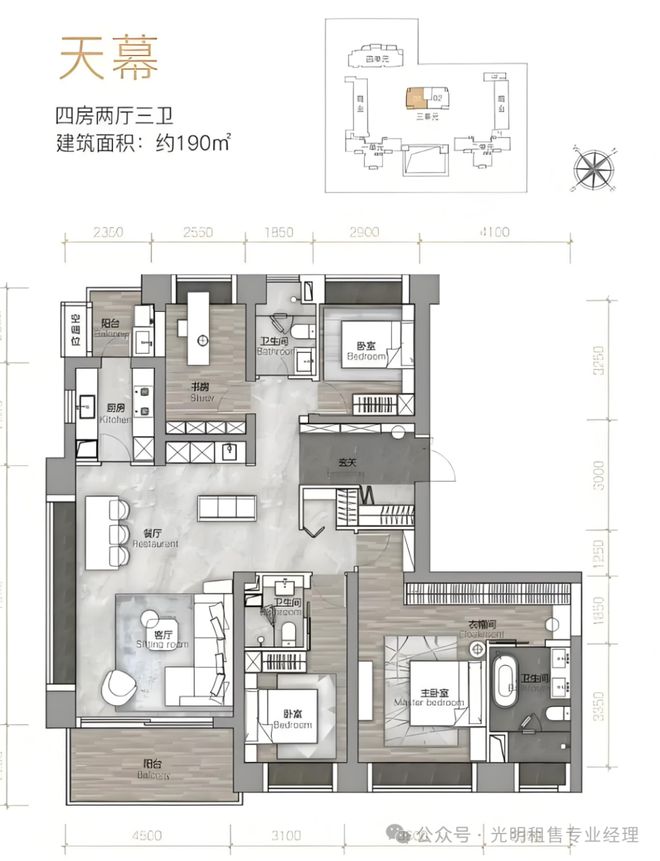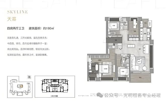 190㎡四房三卫,竖厅双主卧设计,独立玄关和入户,空间上较为宽敞,但是也有不少浪费面积。