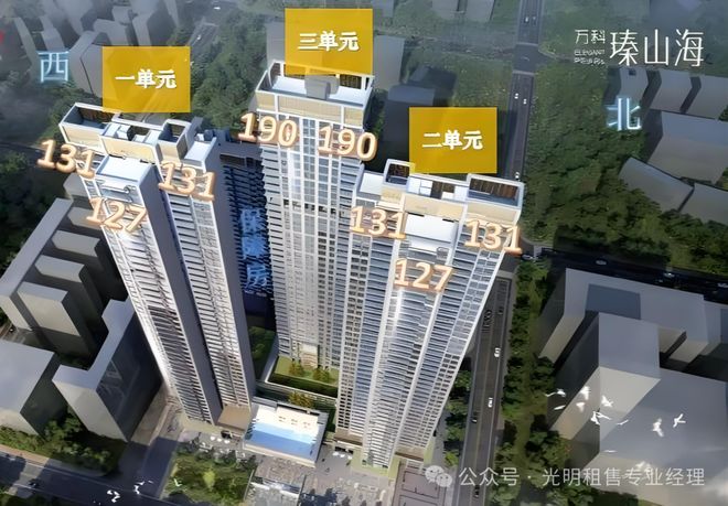 科臻山海由4座高层和超高层住宅、裙房组成,其中:一、二单元高141米45层、三单元高138米40层,四单元高90米29层。