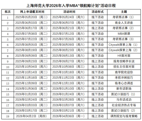 上海师范大学2026年入学MBA考生“领航鲸计划”活动批次安排如下表所示。为方便考生协调安排工作和生活,上海师范大学MBA教育中心将组织多批次活动,考生可根据自己的情况选择适合的批次申请。